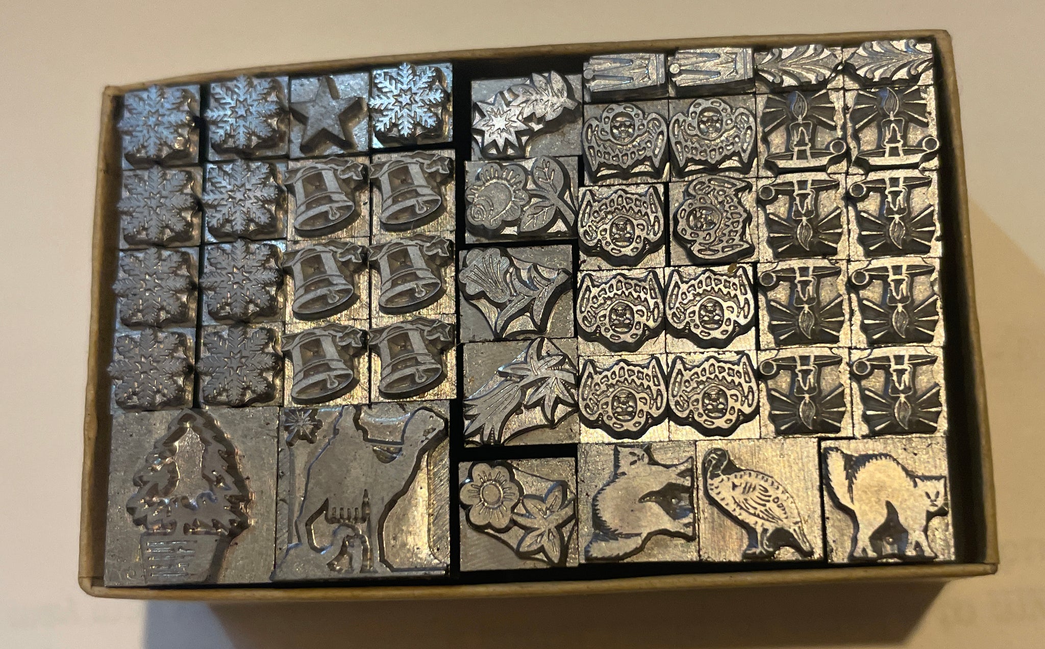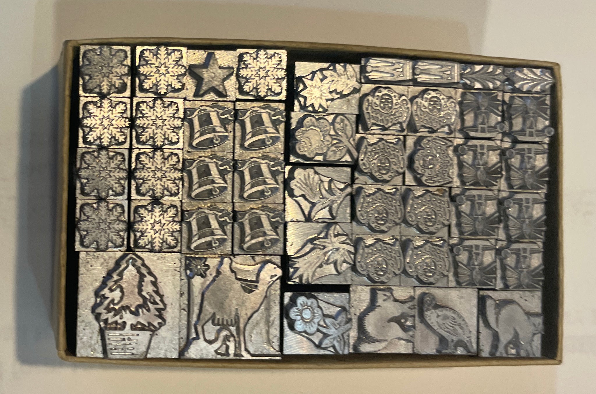 The Bixler Letterfoundry has an amazing collection of matrices to cast ornaments and decorative printers material. This assortment features the following "holiday" ornaments